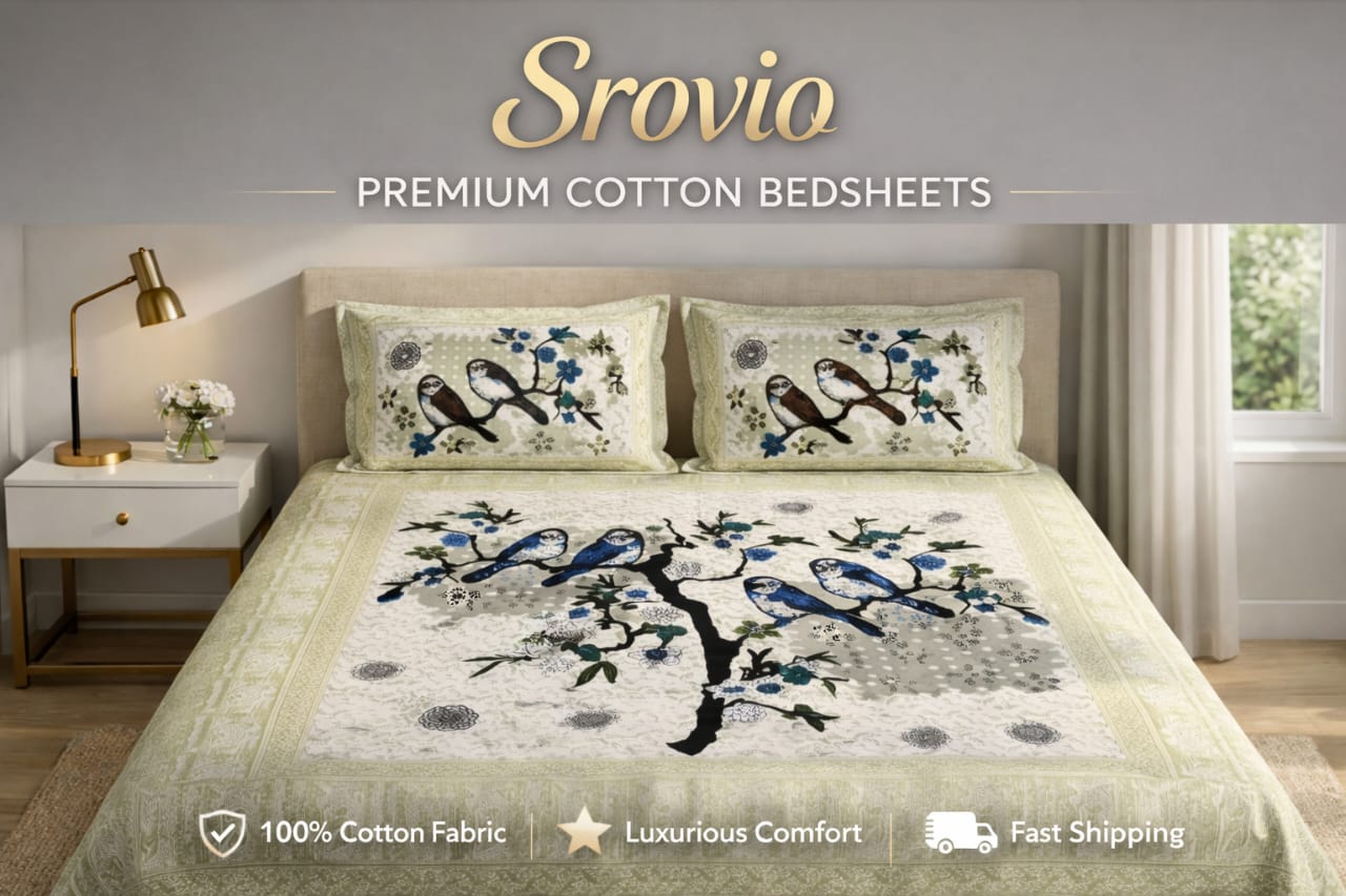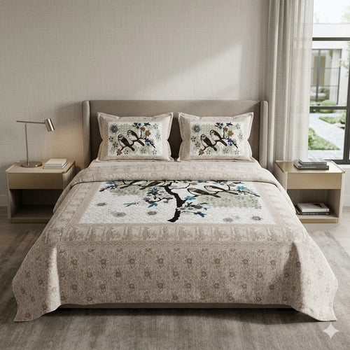 Srovio Jaipuri 100% Cotton King Size Bedsheet (100×108 Inches) – Traditional Bird & Tree Print Jaipuri Cotton Bedspread with 2 Pillow Covers
